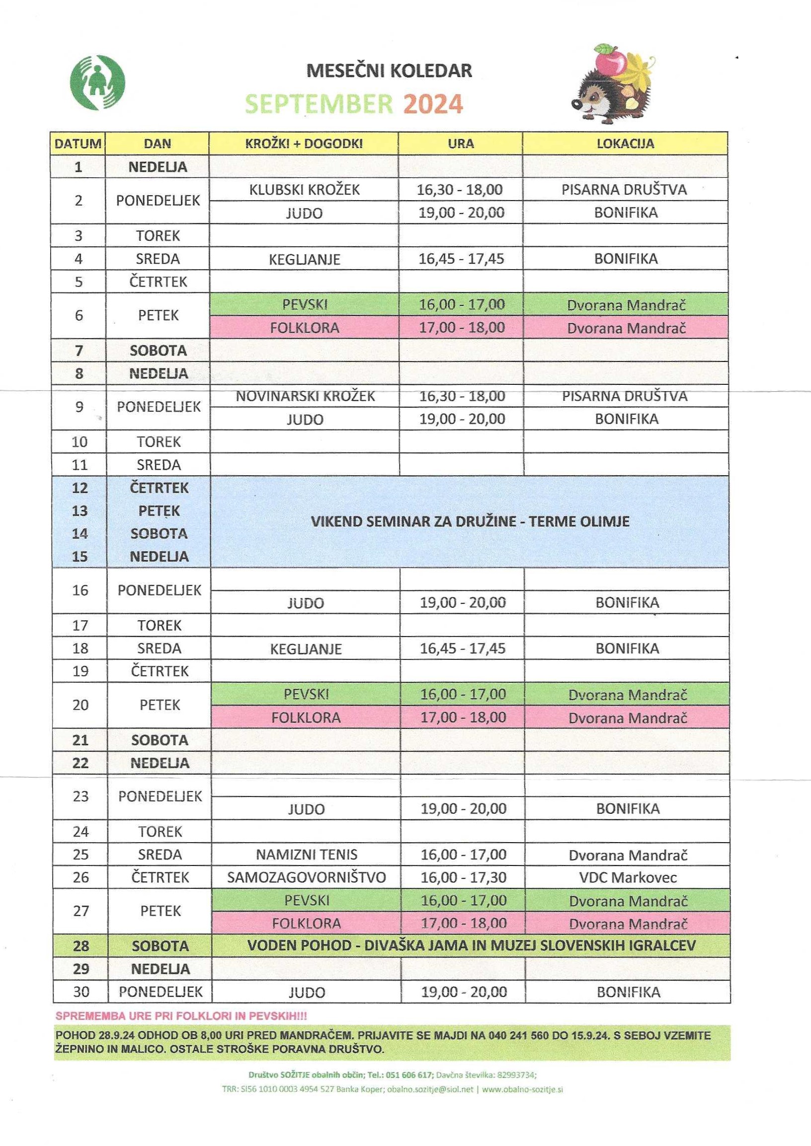 V spodnji tabeli in v koledarju na vstopni strani so vse septembrske aktivnosti podrobno opisane.