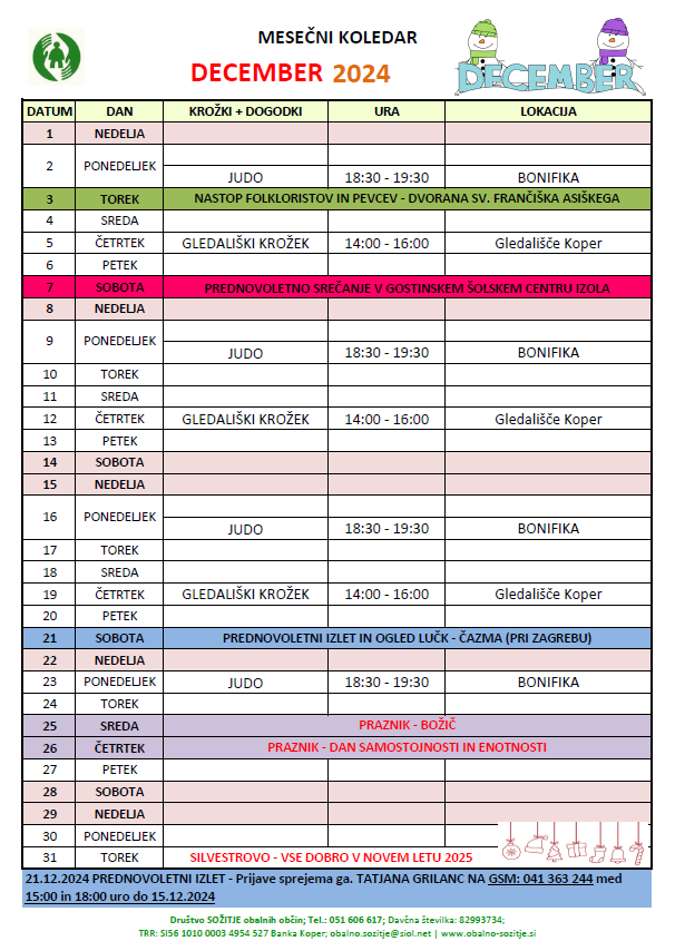 Praznični del meseca se začne s prednovoletnim srečanjem, ki bo 7. decembra v Gostinskem šolskem centru v Izoli in 21. decembra z izletom ter ogledom lučk v Čazmi na Hrvaškem.